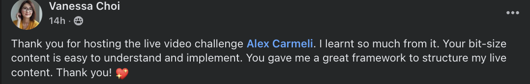 Alex Carmeli is a Video Marketing Strategist living Austin, TX. She is also the founder of the e-learning company Unscripted Moment which helps coaches & course creators build authentic live video experiences that drive income & impact. She is proud to have helped over 2k entrepreneurs create profitable & impactful videos!